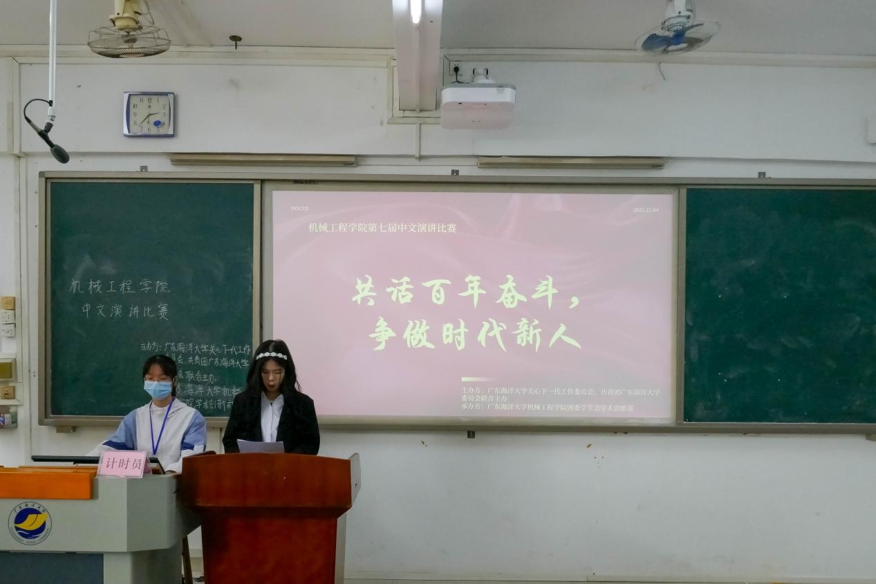 在比赛过程中,参赛选手们有序地上台演讲,首先进行三分钟的主题演讲,然后任意选取其中一个即兴演讲主题,思考30秒后开始1分钟的即兴演讲。选手们慷慨激昂的演讲,回顾了祖国百年奋斗的伟大征程,抒发了要争做百年奋斗青年的见解,立下做时代好青年的斗志。