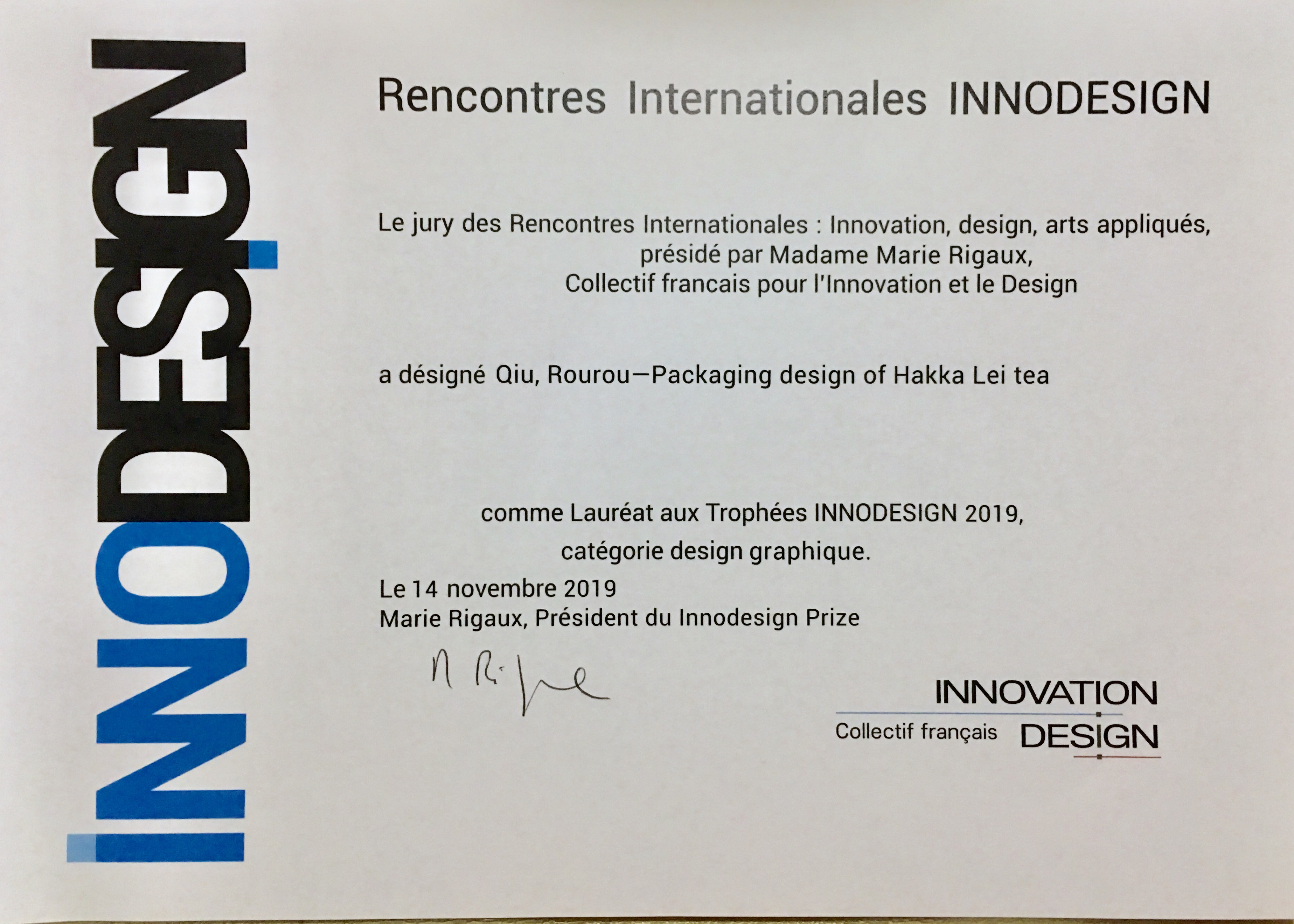 丘柔柔同学在王先昌老师指导和WilliamHill中文官方网站支持下,认真设计、积极备赛,其参赛作品“Packaging design of Hakka Lei tea”革新了传统的使用方式、注重环保与商业相结合、体现了传统文化与现代融合的理念,获得大赛评委良好评价,从各国参赛作品中脱颖而出,荣获2019 年度法国INNODESIGN PRIZE国际创新设计大奖,并受邀出席颁奖典礼,因课程安排未去现场领奖。