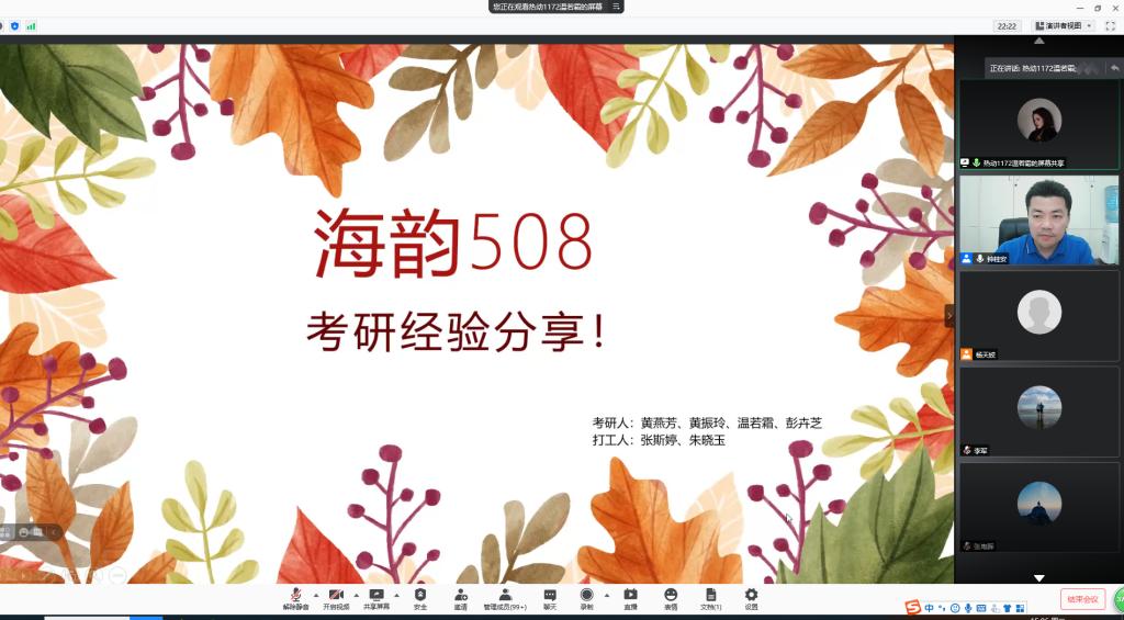 会上,副经理徐青宣读了《公司关于表彰2021年考研先进集体和先进个人的决定》。随后,制冷1174班班主任李军老师作为考研优秀班级班主任代表进行了发言。李老师从入学之初的专业教育到日常关注员工成绩、充分发挥优秀班助的作用,再到备考期间关注员工心理变化、公司公司对考研工作的高度重视和大力支持等多个方面分析了员工考研成功的因素。接着保研至中南大学的建能1171班吴友健、考取华南理工大学的机制1172班苏达权分别分享了自己保研成功及考研成功的经验;考研优秀宿舍海韵B508宿舍代表黄振玲、海安B612宿舍代表唐雄秋从宿舍关系的处理、室友之间互相鼓励互相帮助等角度分享了考研心得。